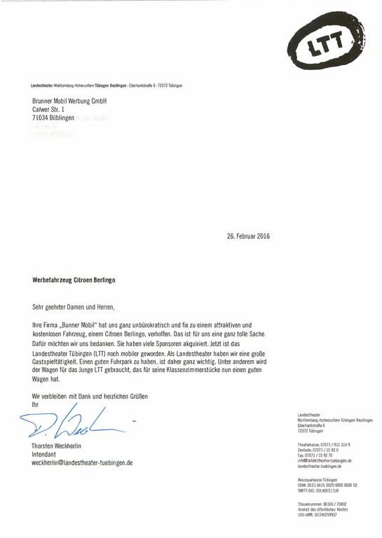 Ihre Firma „Bunner Mobil" hat uns ganz unbürokratisch und fix zu einem attraktiven und kostenlosen Fahrzeug, einem Citroen Berlingo, verholfen. Das ist für uns eine ganz tolle Sache. Dafür möchten wir uns bedanken. Sie haben viele Sponsoren akquiriert. Jetzt ist das Landestheater Tübingen (LTT) noch mobiler geworden. Als Landestheater haben wir eine große Gastspieltätigkeit. Einen guten Fuhrpark zu haben, ist daher ganz wichtig. Unter anderem wird der Wagen für das Junge LTT gebraucht, das für seine Klassenzimmerstücke nun einen guten Wagen hat.