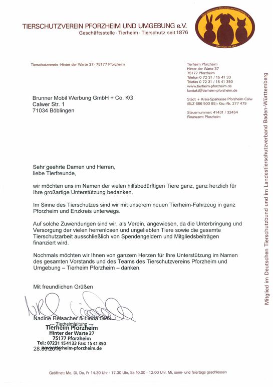 Nochmals möchten wir Ihnen von ganzem Herzen für Ihre Unterstützung im Namen des gesamten Vorstands und des Teams des Tierschutzvereins Pforzheim und Umgebung — Tierheim Pforzheim — danken.