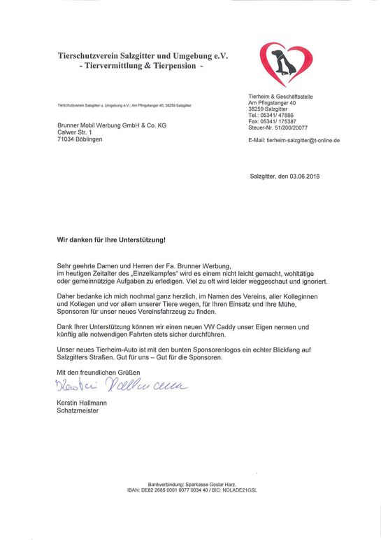 „Unser neues Tierheim-Auto ist mit den bunten Sponsorenlogos ein echter Blickfang auf Salzgitters Straßen. Gut für uns — Gut für die Sponsoren.“